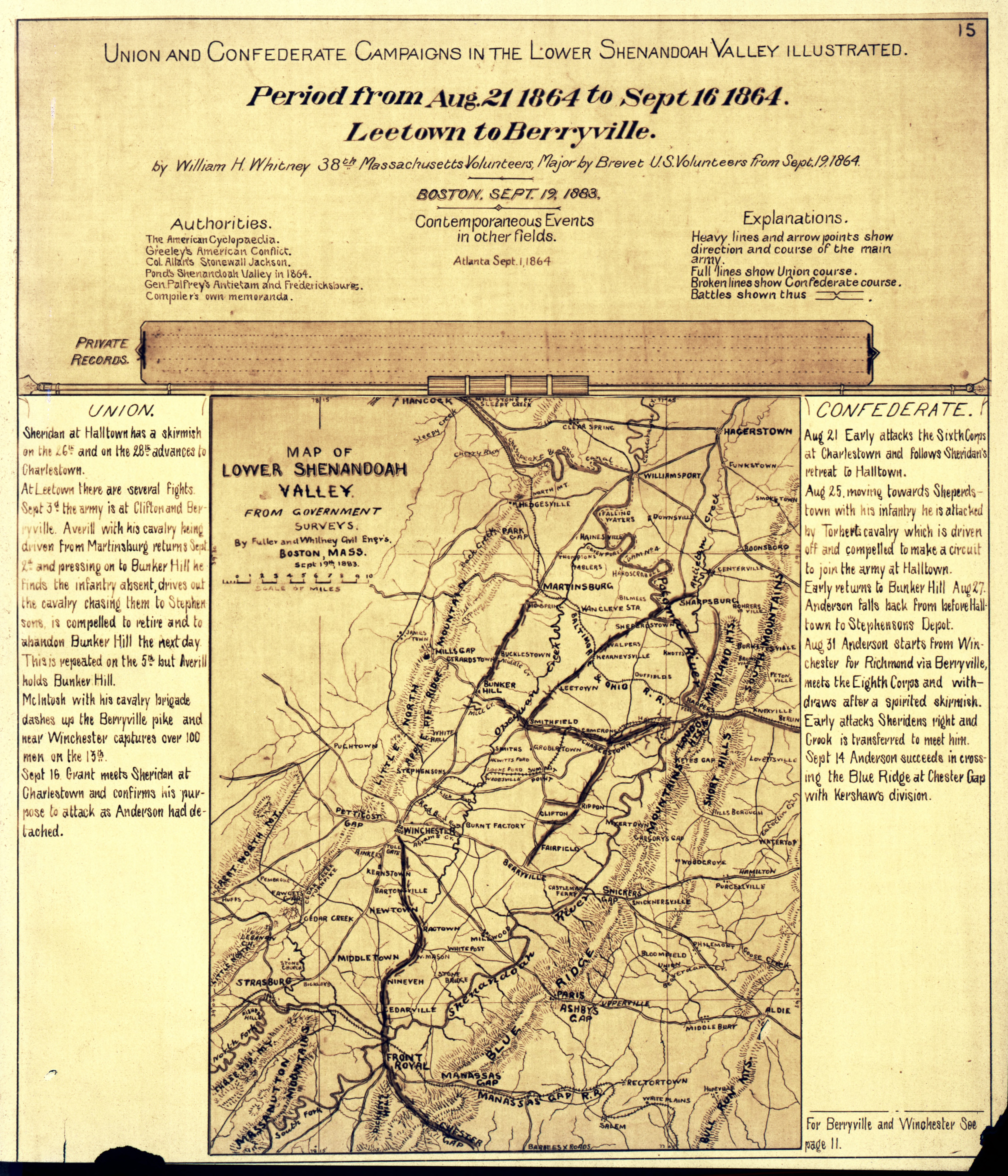 Union and Confederate Campaigns in the Lower Shenandoah Valley illustrated. Twenty-six maps show positions of Federal and Confederate armies. Includes maps of the battles of Winchester: Opequon, Fisher's Hill, and Cedar Creek. < Sample Map > < List of Sheridan's and Early's Armies in the Campaign of 1864 >
