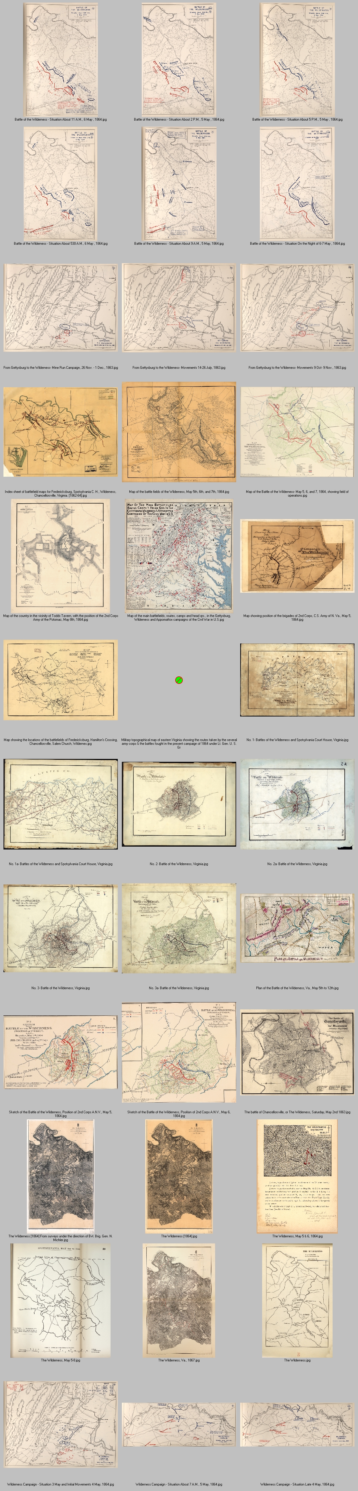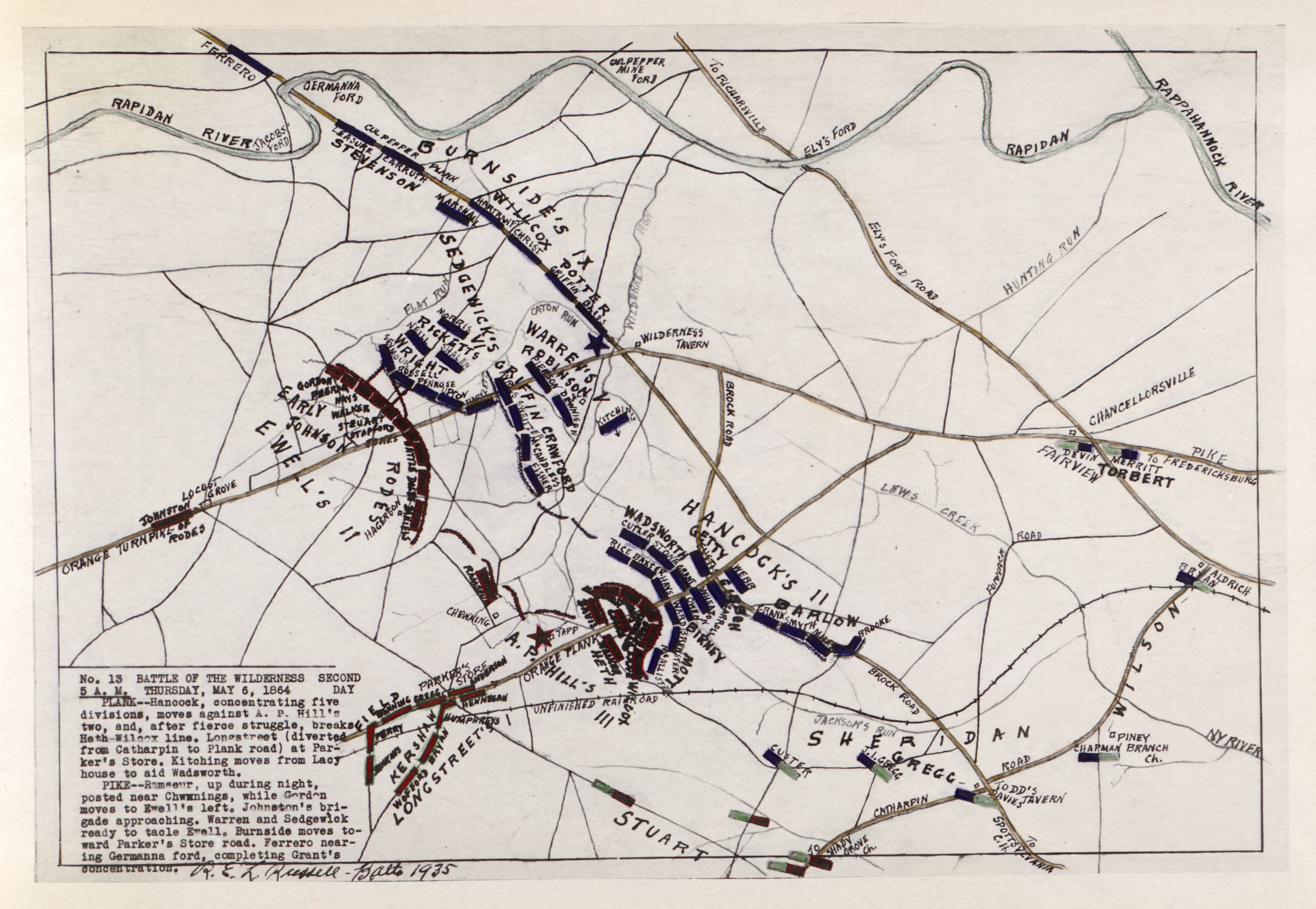 Maps of the Battle of the Wilderness by Robert E.L. Russell. A beautiful set of 26 Pen and Ink maps of the Battle of the Wilderness, May 5-6 and 7, 1864 between Lee (60,000) and Grant (120,000) including the approach and the movement toward Spottsylvania Courthouse. <<<Sample map>>> <<<Map list>>>