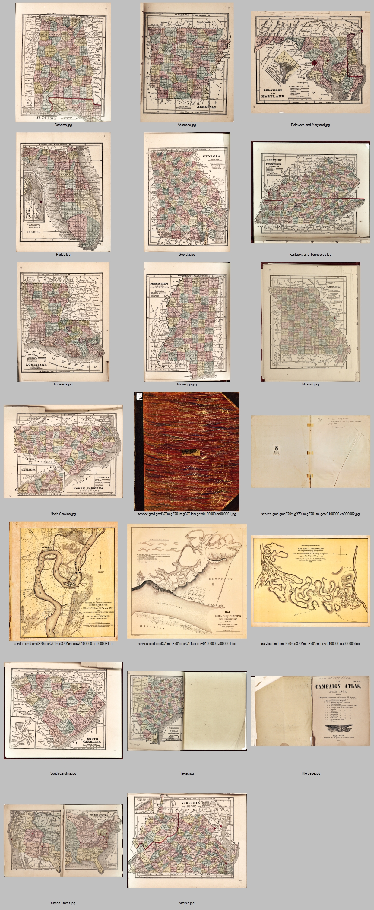 Maps illustrating General Sherman's March to the Sea and through the Carolinas and Virginia. Part 1: Maps showing positions of 20th Corps on march from Chattanooga, Tenn. to Atlanta, Ga. with dates and Union and Rebel defenses. Part 2: Maps showing the campaign of the 20th Corps from Atlanta to Savannah with the dates [and] Union and Rebel defenses, 1864. Part 3: Campaign maps exhibiting the line of march of the 20th Corps from Savannah, Ga. to Goldsboro, N.C. with the plans of the battle fields of Averysboro and Bentonsville, 1865. Part 4: Campaign maps exhibiting the line of march of the Army of Georgia, commanded by Maj. Genl. H.W. Slocum, from Goldsboro, N.C. to Martha's Vineyard, N.C., 1865. Part 5: Maps showing the line of march of the Army of Georgia, commanded by Maj. Genl. H.W. Slocum, from Raleigh, N.C. to Alexandria, Va., 1865. < Sample >