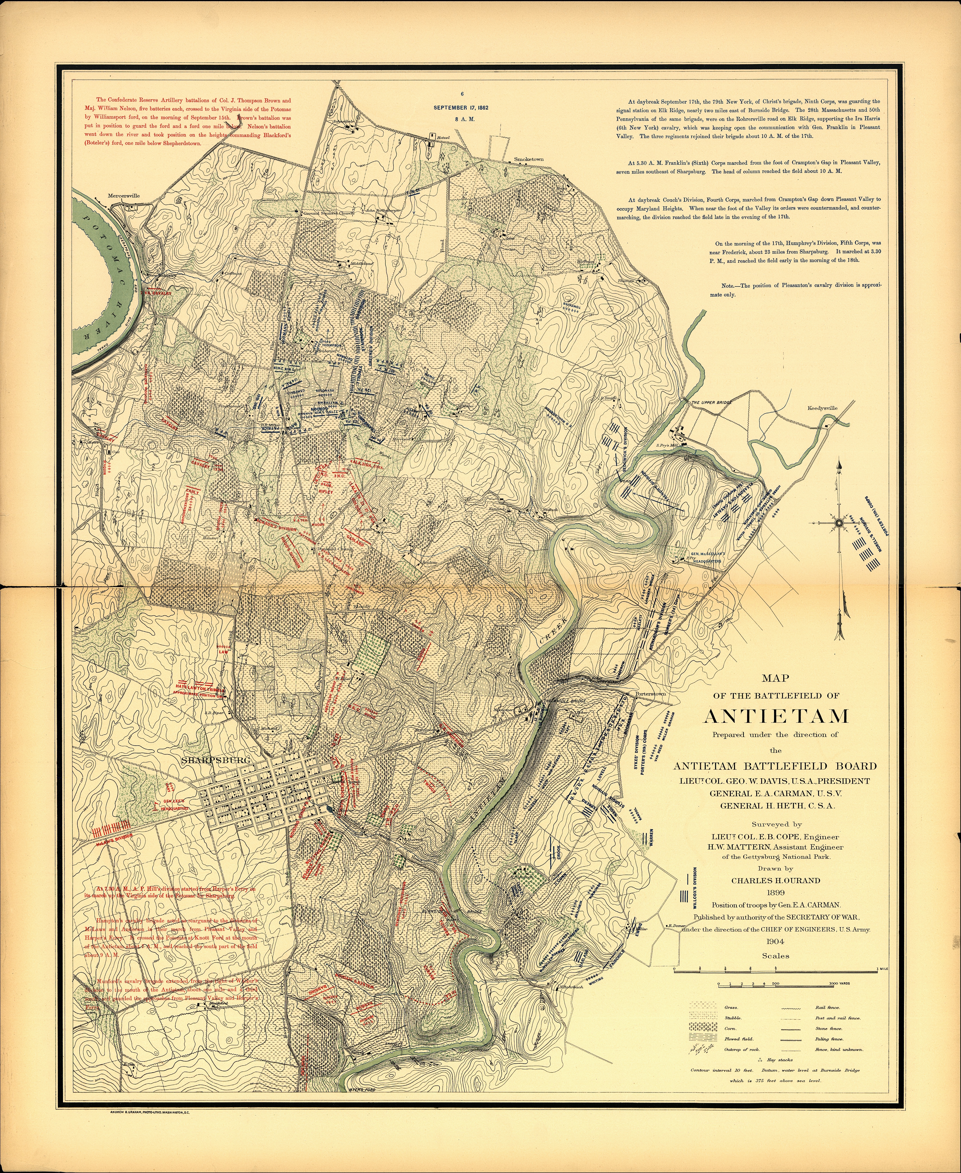 Atlas of the Battlefield of Antietam. Prepared under the direction of the Antietam Battlefield Board, Lieut. Col. Geo. W. Davis, U.S.A., President, Gen. E.A. Carman, U.S.V., Gen. H. Heth, C.S.A. Surveyed by Lieut. Col. E.B. Cope, engineer, H.W. Mattern, assistant engineer, of the Gettysburg National Park. Drawn by Charles H. Ourand, 1899. Position of troops by gen. E. A. Carman. Published by authority of the Secretary of War, under the direction of the Chief of Engineers, U.S. Army, 1904. Relief shown by contour lines. Cover title. "Organization of the Union and Confederate armies at the Battle of Antietam (Sharpsburg), September 17, 1862". <<Sample Map Detail>>>