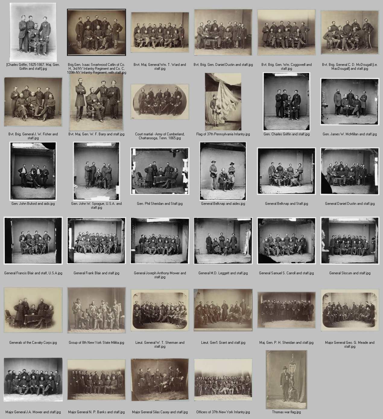 Civil War Photograph Album - Alice Mason. Alice Mason’s album of Civil War photographs is a comprehensive, personal representation of the war. The circumstances of the creation of Alice Mason’s album of Civil War photographs are unclear. There is no way of knowing whose eye and experience informed the selection of these views, whether they were chosen and arranged by Alice Mason herself, or by someone else. Probably assembled in Washington after the conclusion of the war, the album opens with portraits of the defenders of the Union, arranged in order of precedence. <<<Sample>>>