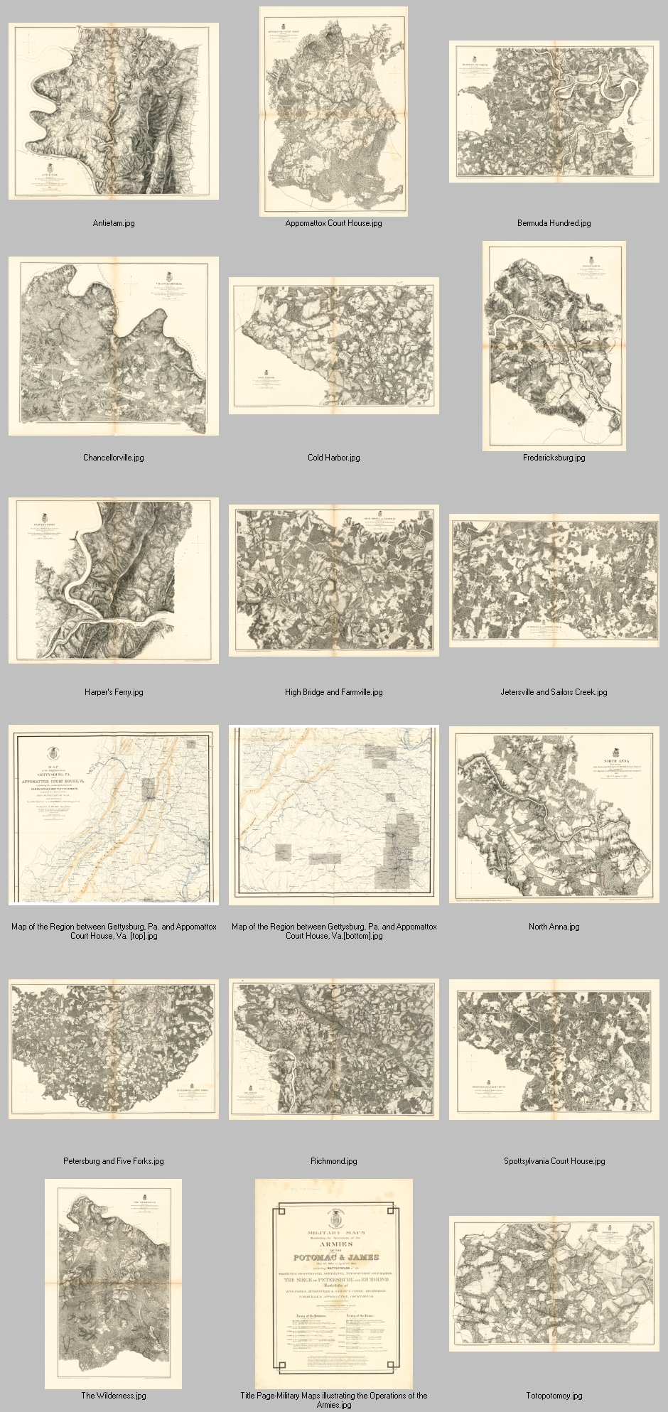 NEW..Military maps of the war of the Rebellion-miscellaneous, [1865-1879]. Bound collection of maps presented to the Library of Congress by Col. C.M. Townsend on October 22, 1940. Collection includes a map of "Central Virginia showing Lieut. Gen'l. U.S. Grant's campaign and marches of the armies under his command in 1864-5," and maps of the battles and/or fortifications at Island no. 10 and New Madrid, Columbus, Forts Henry and Donelson, Drainsville, Blakely, Carnifex Ferry, Nashville, Spanish Fort, Logan's Cross Roads, Cumberland Gap, Perryville, Pea Ridge, Williamsburg, Shiloh, Roanoke Island, Fort Fisher, Belmont, Iuka, Knoxville, Harpers Ferry, Gauley Bridge, Corinth, Big Black River Bridge, and Hagerstown, Funkstown, Williamsport, and Falling Waters, Maryland. <<Sample Images>>