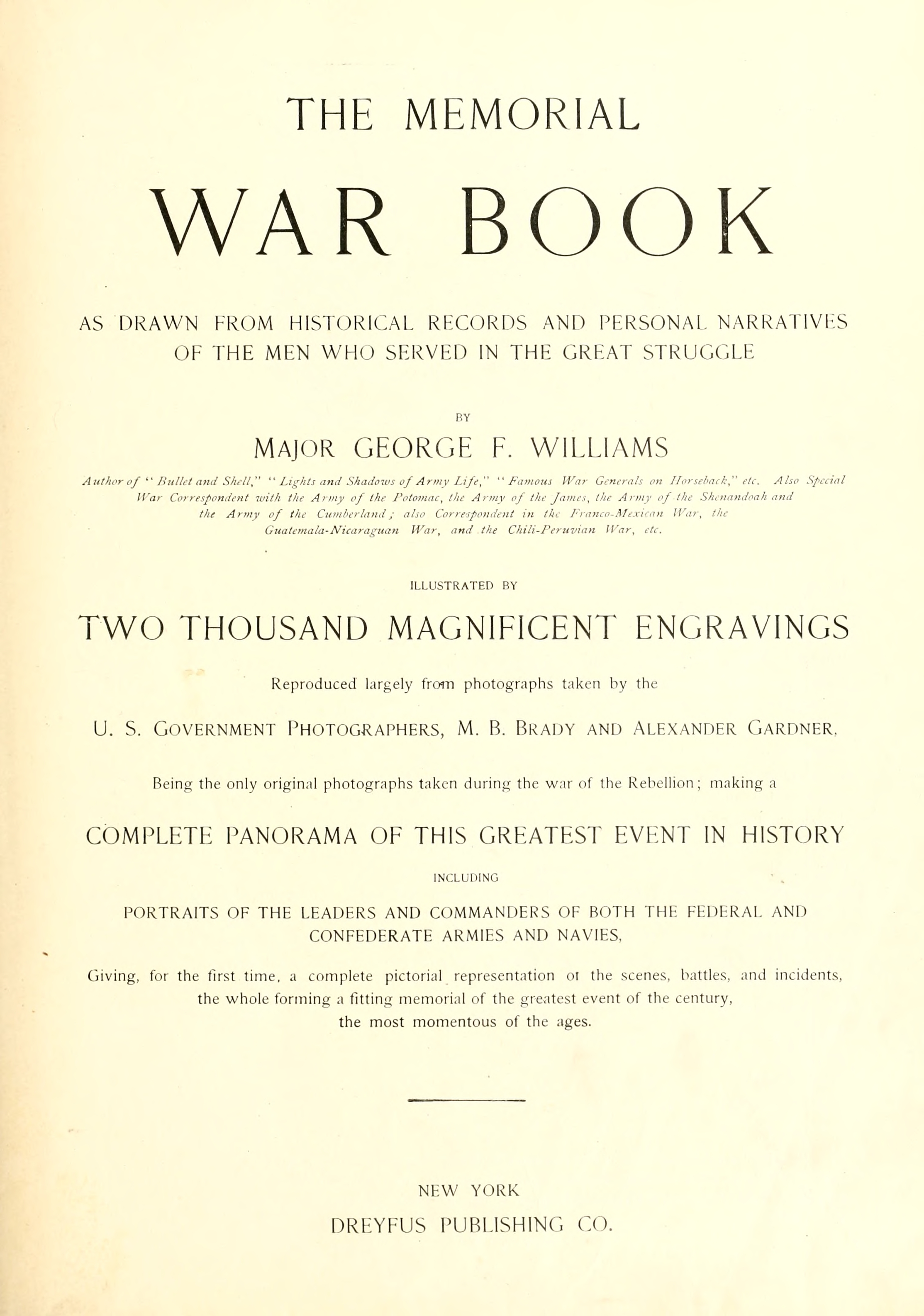 The Memorial War Book. As drawn from historical records and personal narratives of the men who served in the great struggle., by Major George F. Williams. Illustrated by two thousand magnificent engravings reproduced largely from photographs taken by the U.S. Government photographers, M.B. Brady and Alexander Gardner, being the only original photographs taken during the war of the Rebellion. <<Cover>> <<Sample Page>>>