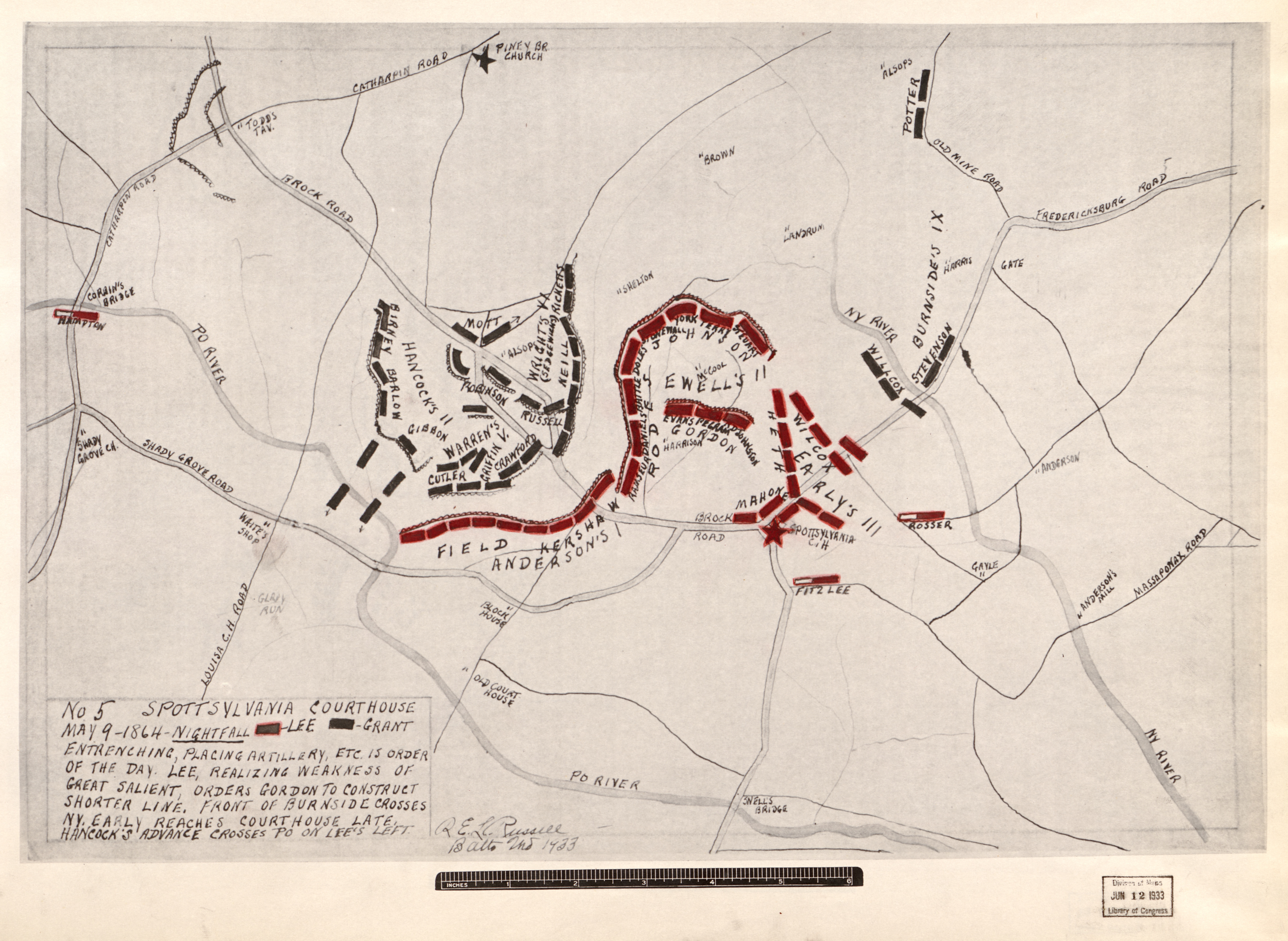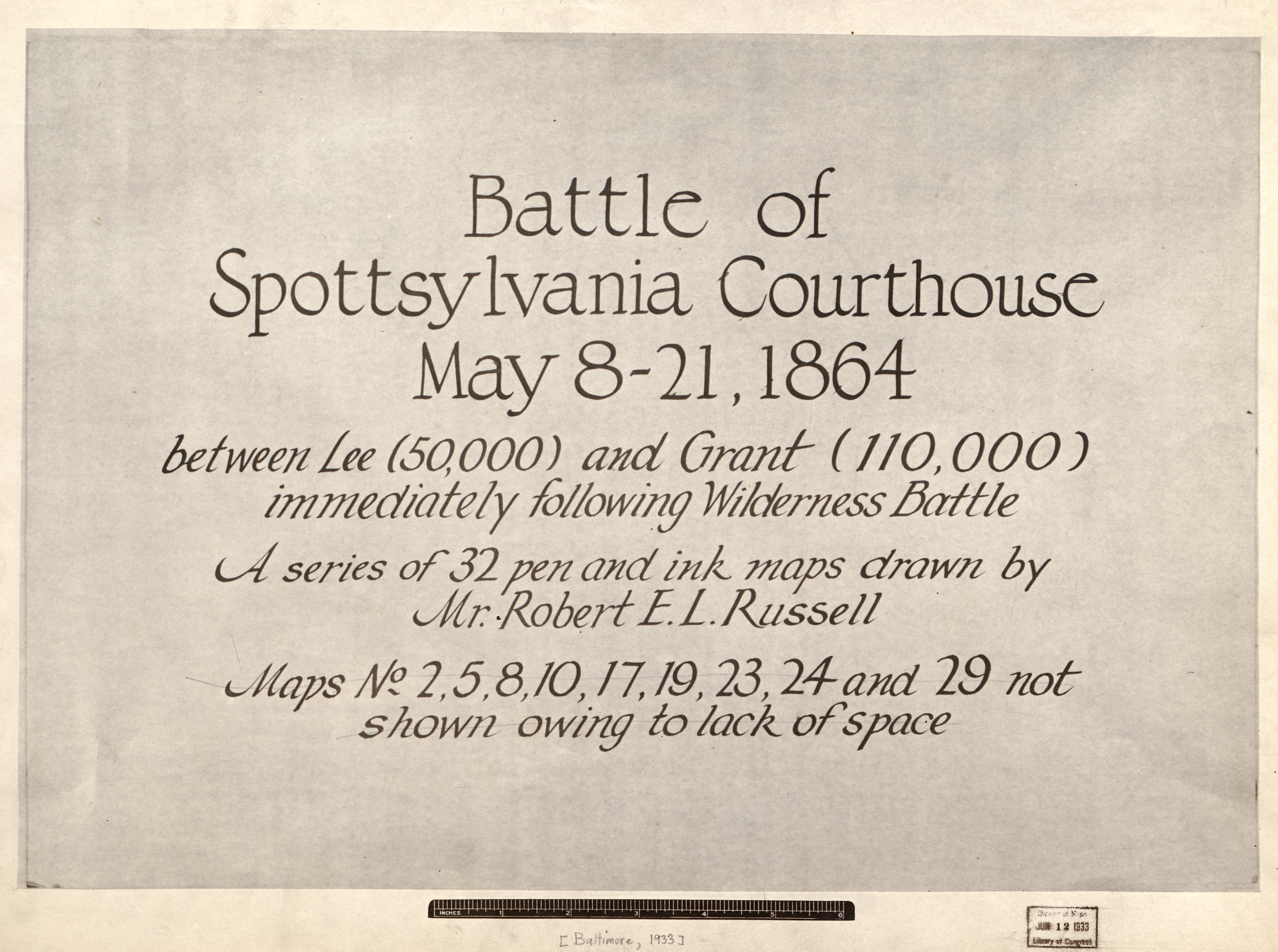 Battle of Spottsylvania Courthouse, May 8-21, 1864 between Lee (50,000) and Grant (110,000), immediately following the Wilderness Battle. A series of 32 pen and ink maps drawn by Robert E. L. Russell. <<<Cover>>> <<<Sample>>>