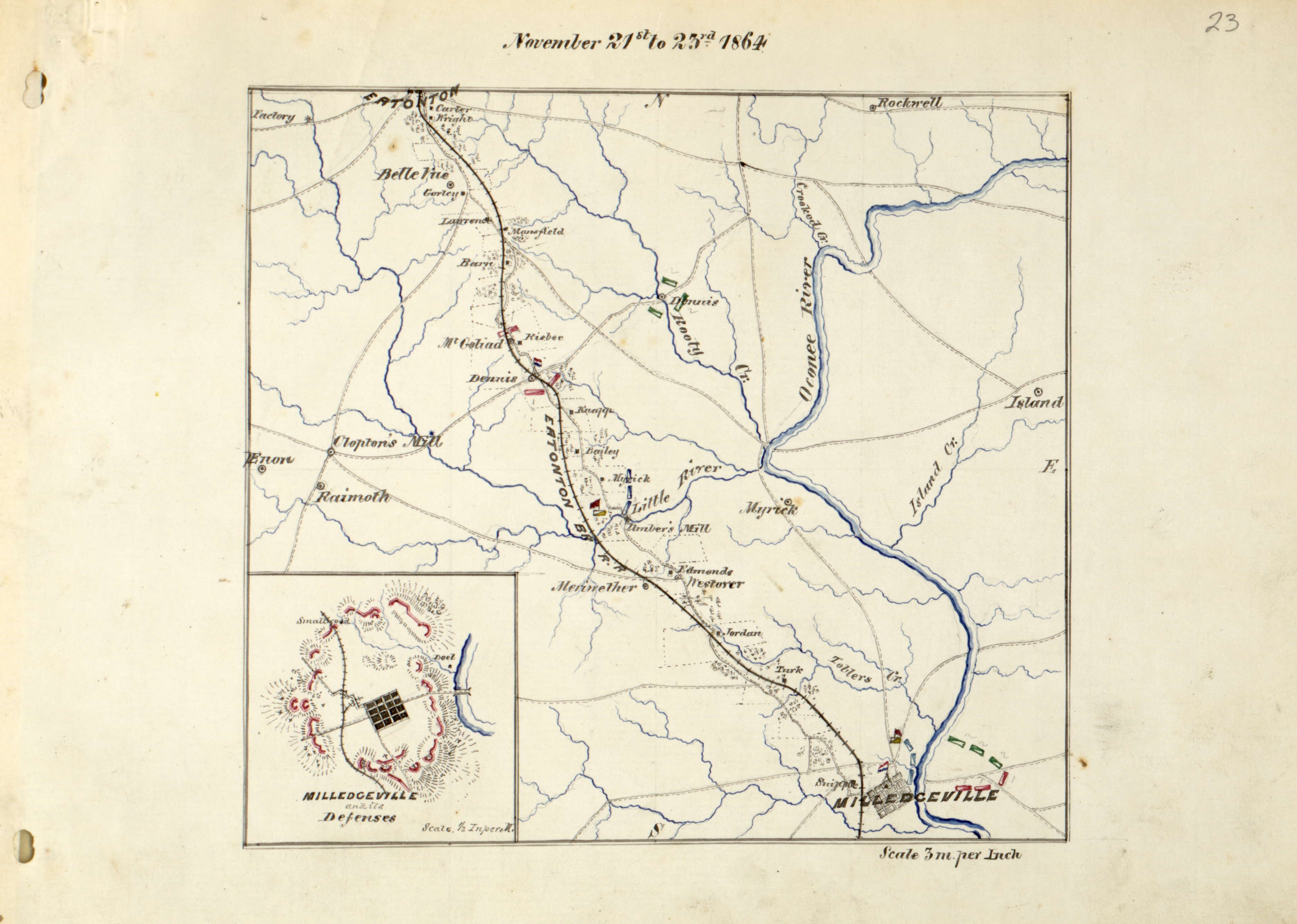 Maps for history of 20th Army Corps, June 1864-May 11, 1865. Set of 28 maps. Maps show General Sherman's march south through Georgia then north to Virginia. Relief shown by hachures. Pen and ink, colored ink, and pencil on paper and tracing cloth. <<<Sample>>>