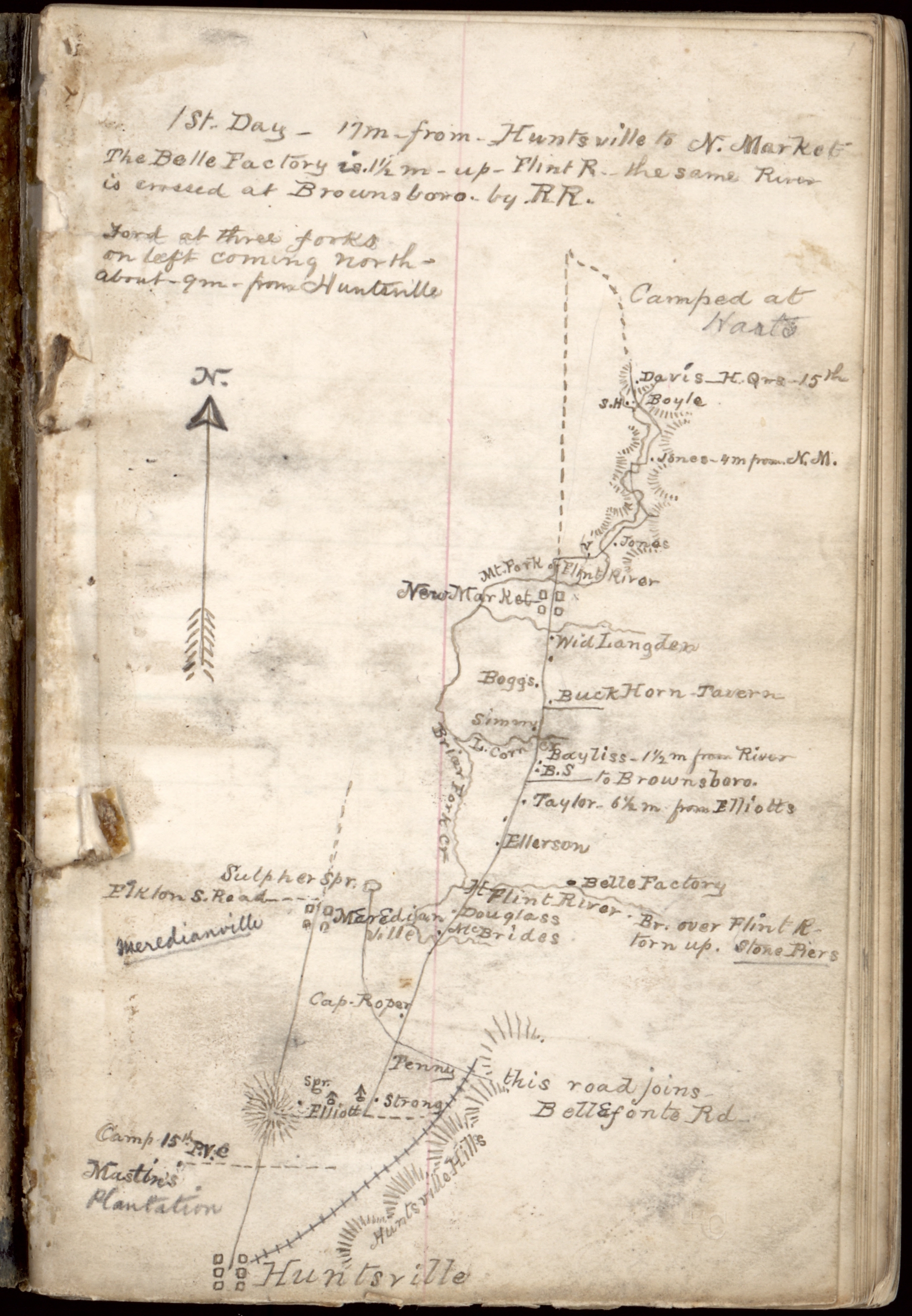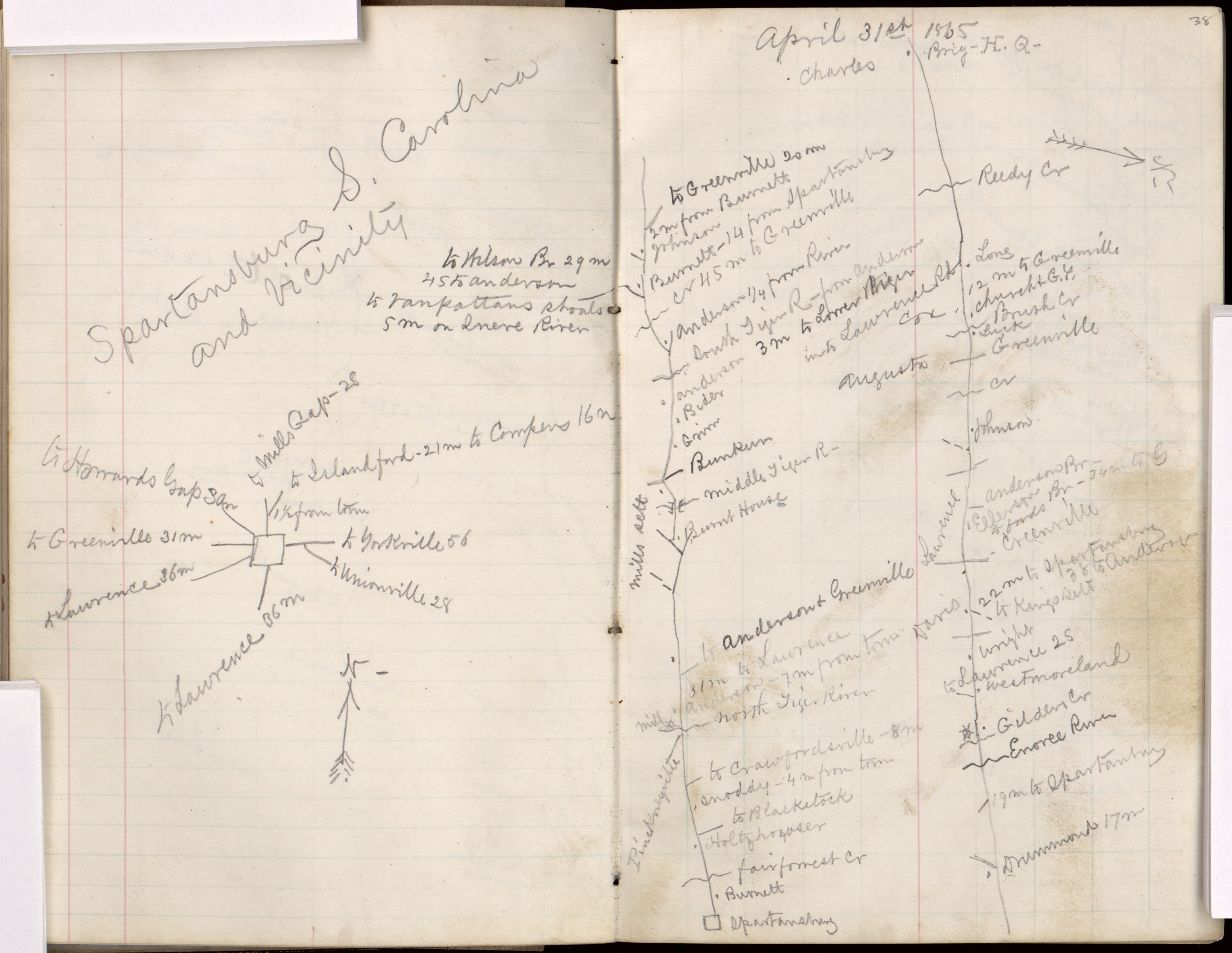 Maps of the March of the 1st Brigade, 1st Cavalry Division. Fifty-five maps drawn in pencil of the March of the 1st Brigade, 1st Cavalry Division, Department of Cumberland on the Stoneman expedition through Tenn., Va., N.C., S.C., Geo., & Ala., March to June 1865. < Sample Map > < Sample Map >