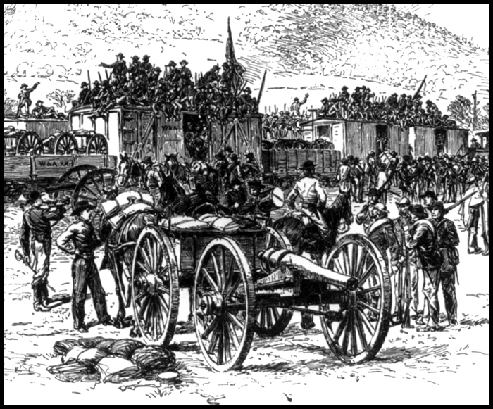 Artwork Detail: Longstreet's soldiers debarking from the trains below Ringgold, September 18, 1863.