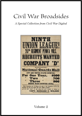 Civil War Broadsides Volume 2 (310images). Broadsides are single sheets of paper, printed on one side only. Often quickly and crudely produced in large numbers and distributed free in town squares, taverns, and churches or sold by chapmen for a nominal charge, broadsides are intended to have an immediate popular impact and then to be thrown away. The broadside was an easily produced and highly visible way for individuals or groups to show their support for a cause. Broadsides were meant to communicate issues of immediate interest to the public. They were posted on walls in central locations so many people would see them. Thus, by the end of the Civil War thousands of broadsides had been printed.