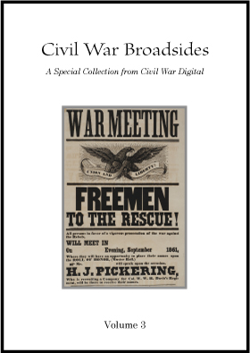 Civil War Broadsides Volume 3 (310 images). Broadsides are single sheets of paper, printed on one side only. Often quickly and crudely produced in large numbers and distributed free in town squares, taverns, and churches or sold by chapmen for a nominal charge, broadsides are intended to have an immediate popular impact and then to be thrown away. The broadside was an easily produced and highly visible way for individuals or groups to show their support for a cause. Broadsides were meant to communicate issues of immediate interest to the public. They were posted on walls in central locations so many people would see them. Thus, by the end of the Civil War thousands of broadsides had been printed.