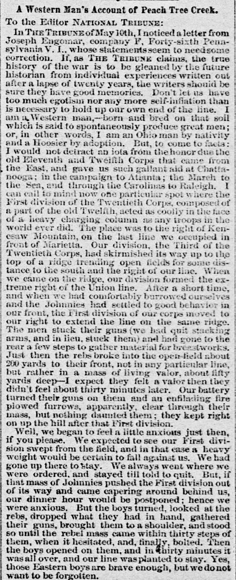 Collection Details: We have collected 900+ full newspaper sheets from the National Tribune Fighting Them Over column into a Fully Searchable Collection. Each issue had multiple articles which brings the number of individual accounts in this collection into the thousands. See the samples below. Note that the samples have been downsampled to a lower resolution. The collection is 300 dpi full resolution.