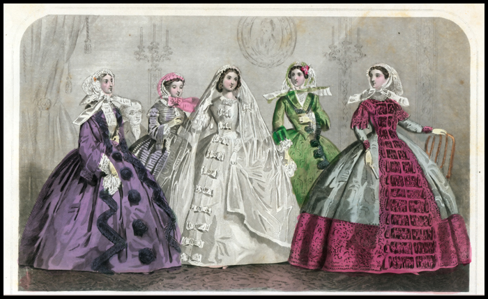 Magazine editor Sarah Hale chose Queen Victoria as a role model of femininity, morality and intellect, and Godey's hired Mrs. Lydia H. Sigourney to report on the royal activities in London. The tradition of a white wedding is began with Queen Victoria's choice to wear a striking white wedding dress when she married Prince Albert in 1840. With American women following styles or dress set by the young Queen, in less than a decade after her wedding Godey’s wrote: “Custom has decided, from the earliest ages, that white is the most fitting hue, whatever may be the material. It is an emblem of the purity and innocence of girlhood, and the unsullied heart she now yields to the chosen one.”