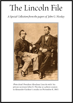 The Lincoln File. Notes, memoranda, occasional correspondence, drafts of chapters and articles, newspaper and article clippings, printed matter, extracts from diaries, and memorabilia collected by John G. Nicolay and Helen Nicolay for their published works relating to Abraham Lincoln; transcripts of diaries and notes of Lincoln’s associates.