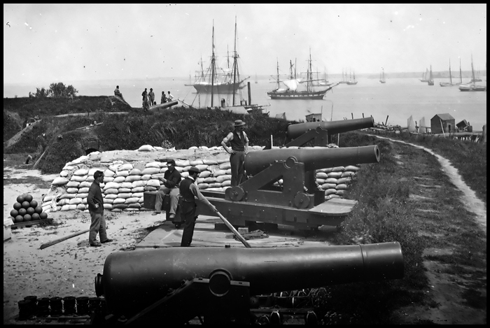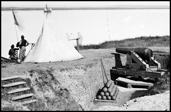 Photo detail: Yorktown, Virginia. Confederate battery. Magruder with 8-inch Columbiads. Federal transports in the river